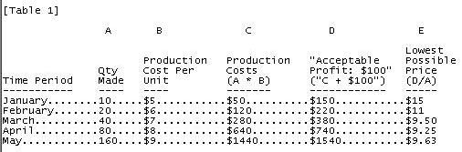 Consider the example below in Table 1. For simplicity, let's assume that "production costs" are total business costs (i.e. all costs the business must endure for the product to exist). Let's also assume that the business has no secondary money sources and must make a $100 monthly profit for the venture to be worthwhile for the business owner.